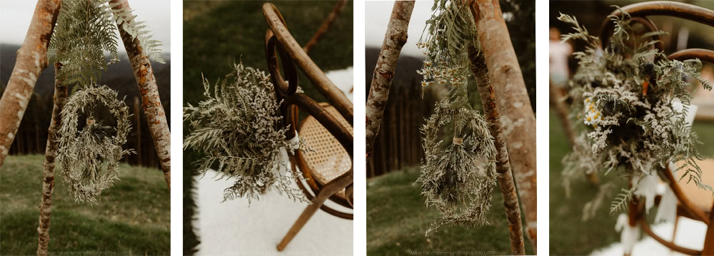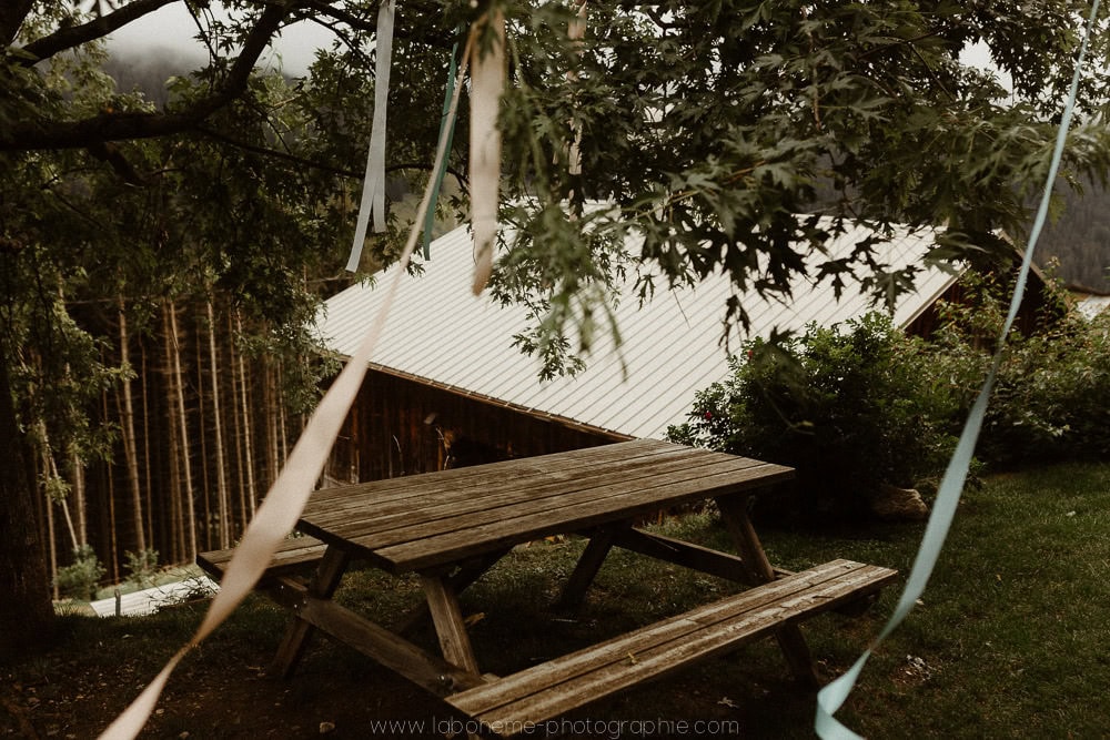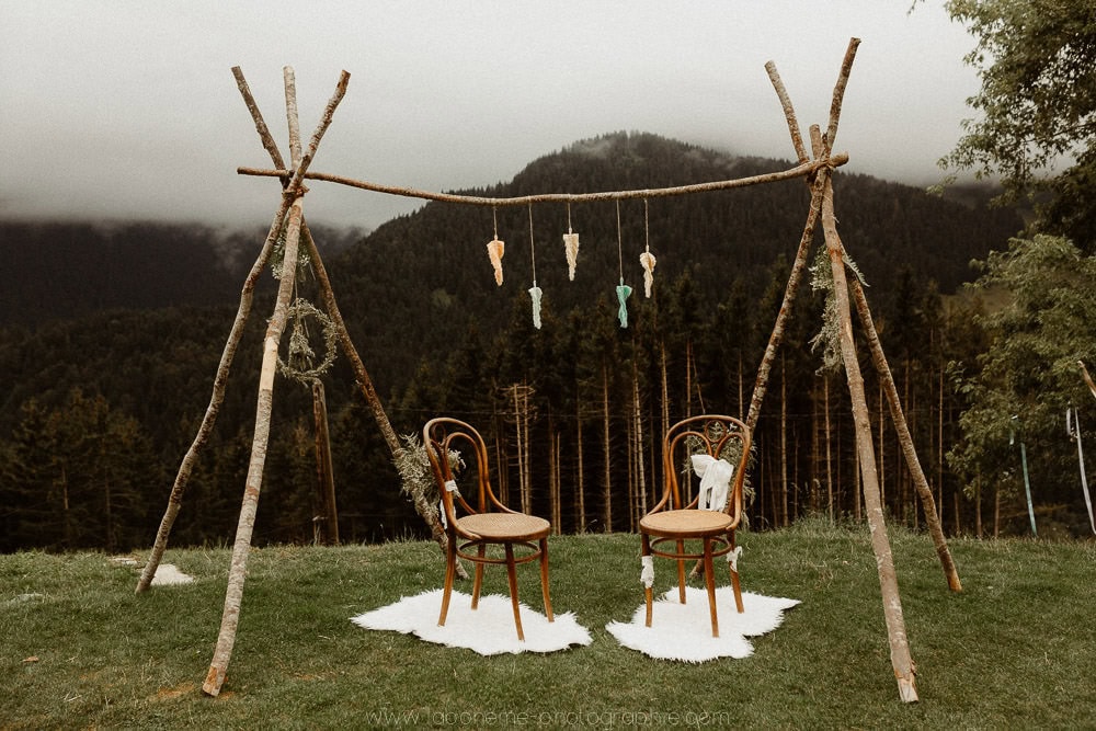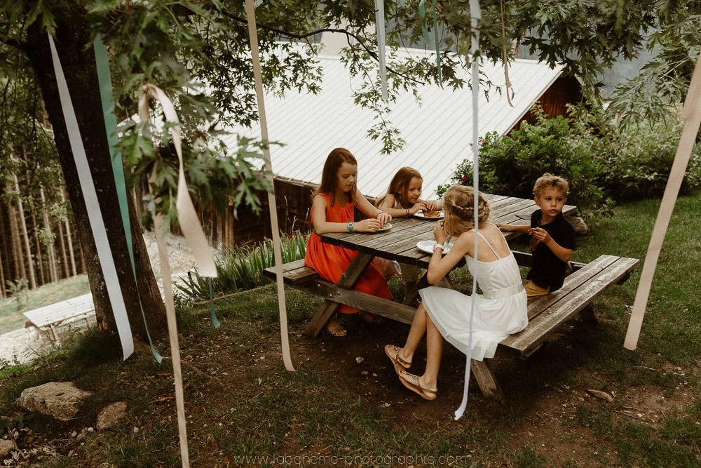 Les mariages à la montagne ont souvent un charme fou, quelque soit la saison, quel que soit le temps. Ici c’était couvert bien qu’en plein mois d’août, mais peu importe. Ces mariages sont le plus souvent détendus, authentiques et humbles à la fois. Avec une décoration brute à base de bois et d’éléments naturels. Jessica avait une jolie robe en dentelle et broderie anglaise qu’elle portait à merveille ! Le mariage de Jessica et Yves était particulièrement convivial, chaleureux et décontracté. J’ai rarement vu une telle décontraction pendant la cérémonie laïque ! Jessica était souvent morte de rire et intervenait pour commenter les discours de ses proches en toute simplicité ! Si c’était une cérémonie très drôle, ce fut aussi très émouvant quand les mariés se sont fait leurs vœux. Puis pour continuer dans le thème, juste après la cérémonie, tout le monde a dansé dès le cocktail, grâce aux musiciens présents ! L’ambiance joyeuse était déjà là, la fête avait bel et bien commencé ! Après tout, pourquoi attendre la fin du dîner ?