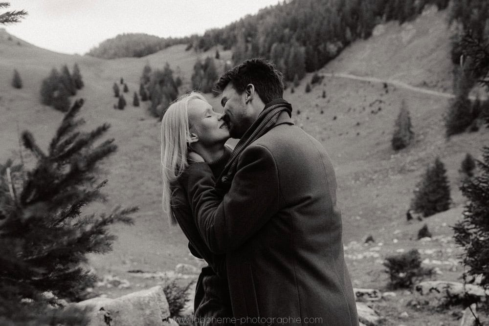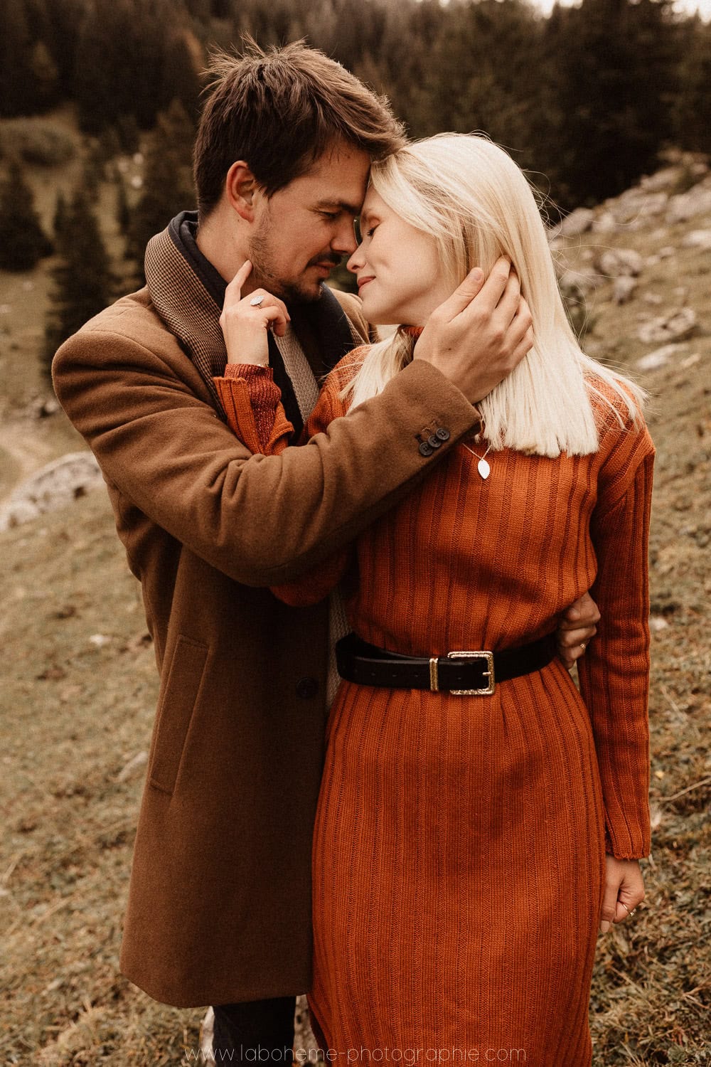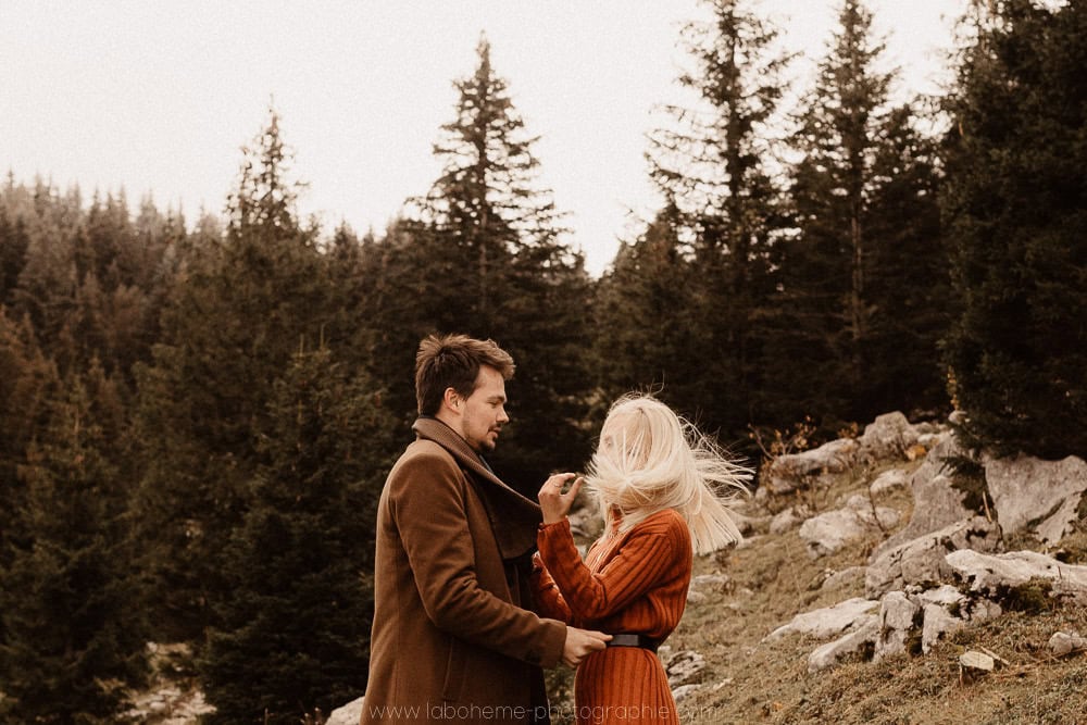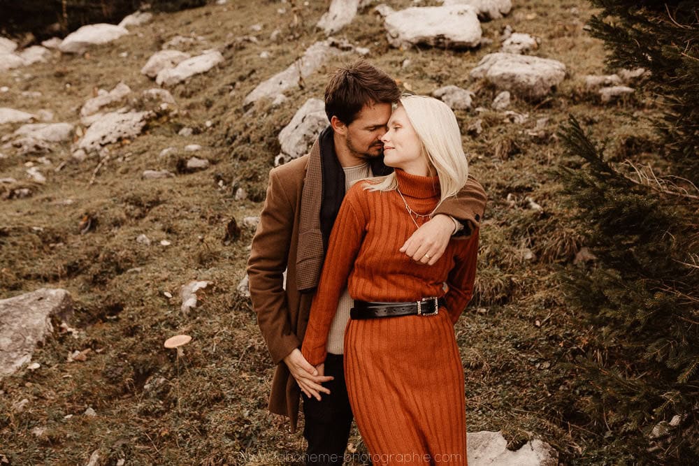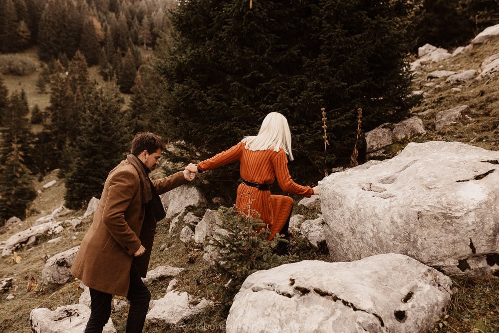 Oriane et Clément m’ont contactée pour faire une séance couple au Parmelan. Après leur mariage, ils ont voulu refaire des photos de couple pour prendre le temps. Ils ont aimé mes photos de couple à la montagne, au Parmelan, l’ambiance qui s’en dégageait. Alors le choix du lieu a été vite fait. On s’est retrouvé mi-octobre là-haut un matin. Et je peux vous dire que ça caillait !! A peine 0 degré, on a eu les doigts très vite congelés ! En rentrant, je me suis dis « c’est fini les séances à la montagne, il fait trop froid maintenant » ! J’ai mis la journée à me réchauffer avant de devoir sortir à nouveau pour une autre séance. Puis quand j’ai déchargé mes cartes et édité les photos, je me suis dis que finalement ça en avait valu la peine ! Je crois qu’une séance couple au Parmelan c’est magique à chaque saison en fait !