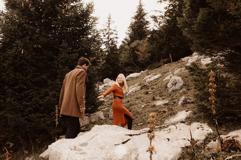 On a fait une partie dans les alpages encore verts. Et j’adore la robe rouille d’Oriane qui ressort à merveille ! Puis on est descendu un peu pour faire des images devant la tête du Parmelan et là, c’était tout orangé des couleurs de l’automne ! Carrément beau !! Vraiment l’automne est définitivement ma saison préférée. Les couleurs sont vraiment époustouflantes. Et vous allez voir que la blondeur des cheveux d’Oriane ressort particulièrement bien dessus !